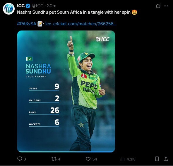 Sandhu finished with remarkable figures of 9-2-26-6 as Pakistan bowled out the Proteas for 115 in 25.5 overs after being asked to bowl first. In doing so, she surpassed India’s Ekta Bisht, who previously held the record for the best figures by an Asian left-arm spinner in Women’s ODIs. Notably, Bisht’s record came against Pakistan during the 2017 World Cup Qualifier in Colombo.